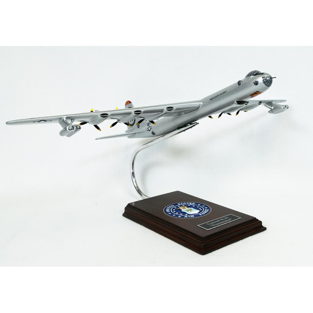 Six pusher radial engines, mounted on the trailing edge of the wings, powered this big long-range SAC bomber. The D, ""burn and turn"", model was boosted by a pair of turbojet pods under the outer wings. A strategic bomb built by Convair for the United States Air Force. The Convair B36 Peacemaker is said to be the very first bomber that had intercontinental range and was also the first thermonuclear weapon delivery vehicle. The Peacemaker was the largest combat aircraft ever built. Its 230 foot wingspan is almost fifty percent longer than that of the huge B-52 that replaced it. The B-36 was one of America’s major deterrents to violence by a prospective adversary for eight years. From 1948 to 1958, the B-36 became part of the USAF Strategic Air Command. Major General Henry Arnold described the B-36 as the plane that could “fly the skin off any rivals”. The Peacemaker was also the first Cold War Bomber. Unlike any other aircraft that were seen in wars dropping bombs or firing an enemy, the B-36 was never seen in any of these actions. Instead, the Peacemaker was closest seen during the 1956 Hungarian Revolution and the Suez Crisis where it was dispatched to Turkey and Morocco. Thus, the Peacemaker is famous for never having fired a shot in anger and the plane that kept peace for ten long years. The B-36 Peacemaker was also involved in two aircraft collapse incidents, one was last February 13, 1950 in an unpopulated region of British Columbia and it was the first loss of an American Nuclear Weapon. The other one was on May 22, 1957 when a B-36 accidentally dropped a bomb on a deserted area while landing at Kirtland AFB in Albuquerque. A total of 388 B-36 Peacemakers were produced. The last one was built on August 1954. Then on June 29, 1955 the first B-52 was delivered to SAC. All Peacemaker models were delivered and converted to J models on which two jet engines were added to each wing. The last B-36 Peacemaker made its final flight in 1959. |