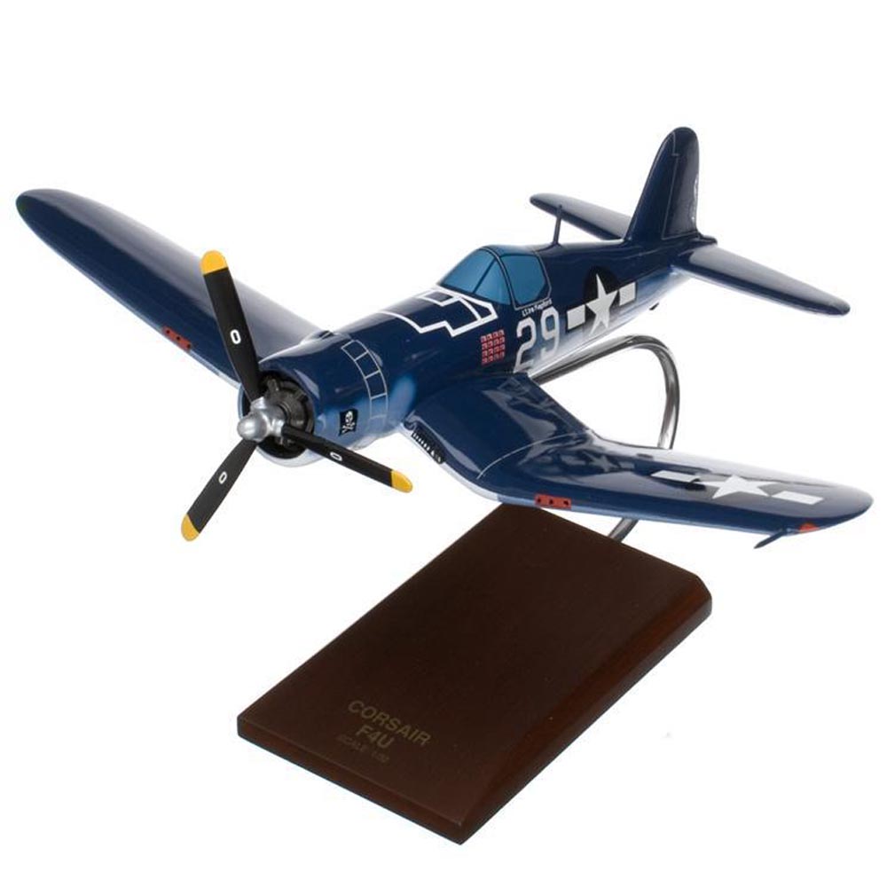 This high quality replica is handcrafted from mahogany and comes with a wooden base. Length is 12-1/2" and wingspan is 15". Scale is 1/32. The F4U Corsair was a single-engine aircraft. It was conceived to be using the most powerful engine and the largest propeller a fighter aircraft ever had. The long propeller blades caused ground clearance problems, while the “W” shaped wings helped reduce the length required for the landing gear to provide good visibility on the sides. The F4U Corsair was called the “Ensign Eliminator”, a strong engine torque which didn’t make it an easy plane to land. The F4U Corsair aircraft went into production in 1942. There were different World War II aircraft variants and the F4U-1D Corsair was one of them. The F4U-1D was a fighter aircraft that served the US Navy during World War II and Korean War. It became the first United States single-engine production aircraft that was capable of reaching 400 mph. The F4U-1D was built in parallel with the F4U-1C, a variant that was in production in 1943 but entered the service in 1945. The F4U-1D Corsair was introduced in 1944. It was the Fighter-Bomber variant because compared to other variants it had a double payload of rockets which was exactly what the US Navy needed. It weighs 4100 kg/9040 lbs when empty and 6400 kg/14100 lbs when full; its engine is Pratt & Whitney R-2800 Double Wasp, 18 cylinders and power of 2200 hp; the aircraft’s armament is 6 x 12.7 mm (.50cal) machine guns in the wings; and max speed of 635 km/h and ceiling of 11280 m. |