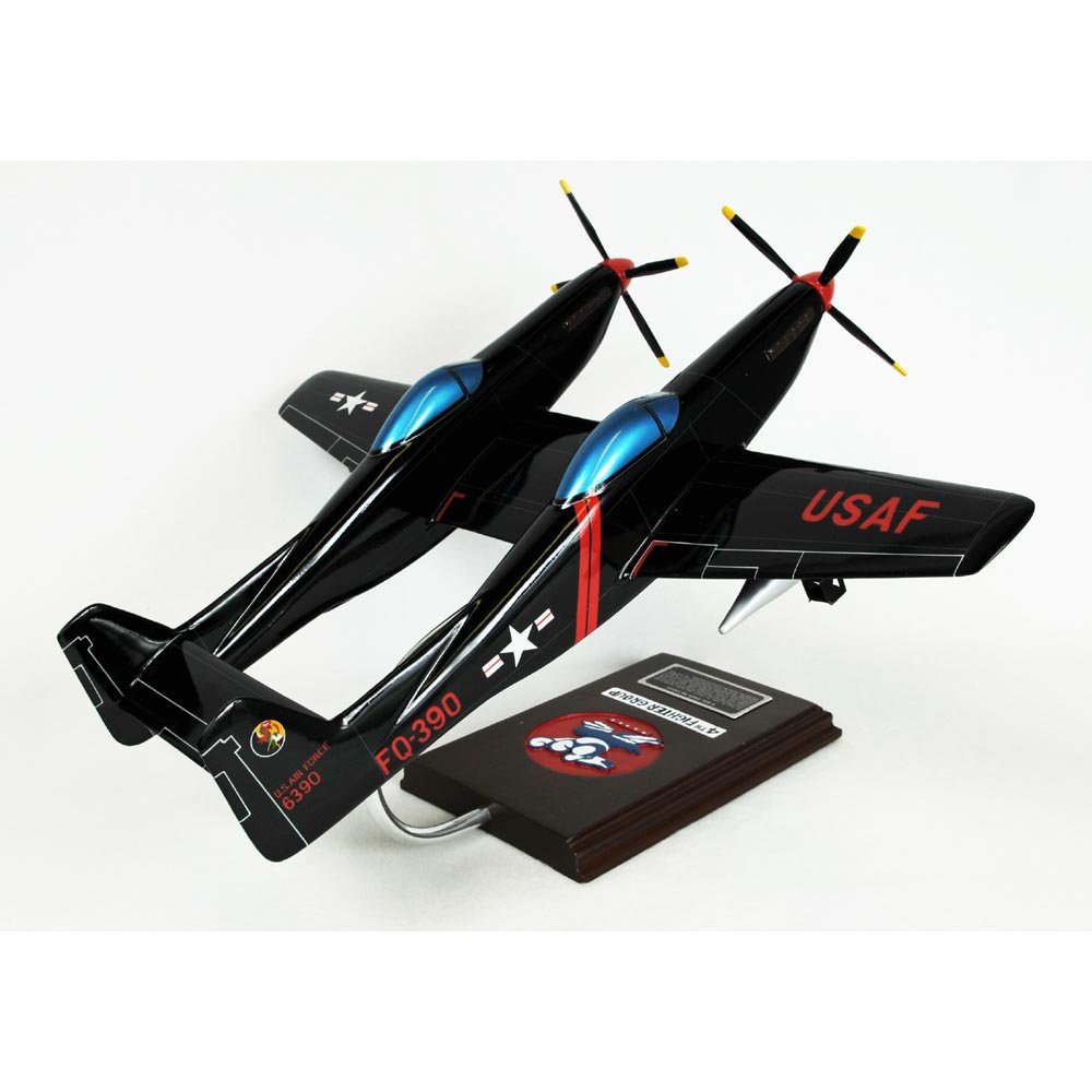 This high quality replica is handcrafted from mahogany and comes with a wooden base. Length is 16-1/4" and wingspan is 20-1/2". Scale is 1/32. The F-82 Twin Mustang is a heavy fighter manufactured by North American Aviation and was based on the P-51 Mustang. The F-82 was originally designed as a long-range fighter in World War II though its role was changed to night-fighting. On June 11, 1948, United States Air Force eliminated the P designation for pursuit and replaced it with F which pertains to fighter. The night fighter versions which were designated the F-82F/G required numerous modifications such as the removal of the right side cockpit to be replaced with a radar operators position lacking flight controls. The most significant modification was the addition of a long radar pod attached to the underside of the center wing. The first F-82G that became operational was in late 1948. In mid 1949, F-82 became widespread and some of the E/F/G models were used by the United States Air Force. F-82Gs were also deployed to the 347th Fighter Group in Japan. The F-82G, though it missed its opportunity to fight in World War II, it distinguished itself during the Korean War. The F-82G has a crew of two. It has a maximum speed of 400 knots and a range of 1,950 nm. It incorporates 2 Allison V-1710-143/145 liquid-cooled V12 engines. The primary user and operator of the F-82 Mustang is the United States Air Force. Theres a total of 270 F-82s built. Currently, there are three F-82s known to have existed. |