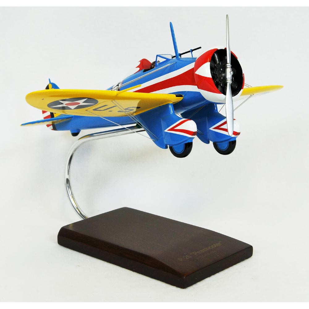The American Boeing P-26 (Peashooter) was the first all-metal production fighter aircraft and the first pursuit monoplane used by the United States Army Air Corps. The diminutive Peashooter, as it became affectionately known by service pilots, was faster than previous American Combat aircraft, however it was also an anachronism. The Peashooters wings were braced with wire, rather than with the rigid struts used on other airplanes, so the airplane was lighter and had less drag. Its initial high landing speeds were reduced by the addition of wing flaps in the production models. The P-26 flew 27 mph faster and outclimbed biplane fighters, thats why the Army ordered 136 production-model Peashooters. The first Boeing P-26 major combat mission was the Chinese Model 281, in what was the worlds first air-interception and destruction of raiding monoplane aircraft. The P-26 remained in active service for many years. In November 1940, a full year after the start of World War II, the U.S. Armys entire fighter strength in the Philippines consisted of only 28 P-26s. Most of P-26 were destroyed in the first Japanese attacks, but two of them, flown by Philippine pilots, became the first American fighters to shoot down Japanese airplanes. Two original P-26s are known to exist. One is in the collection of the National Air and Space Museum, while the other has been owned for many years by the Planes of Fame Museum located in Chino, California. |