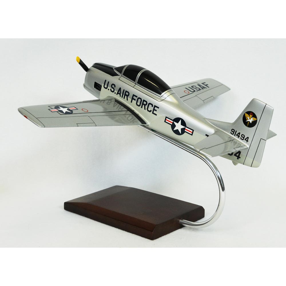 This high quality replica is handcrafted from mahogany and comes with a wooden base. Length is 12-1/4" and wingspan is 15" When the United States Air Force (USAF) set out to replace the aging T-6 Texan trainer, North American Aviation (NAA) was hired to do the job. The design presented by NAA was so successful that a contract for two prototypes was awarded. The USAF was impressed with the prototypes after an evaluation and an initial flight on September 24, 1949. The new aircraft, designated the T-28 Trojan, entered prodution the following year, becoming the first all-new post World War II trainer. It had a frameless canopy and piston engine, with a top speed that often exceeded 280 mph. It was the first trainer designed to transition pilots to jet aircraft. However, plans to utilize it for both basic and advanced training had to be changed when it turned out that the speed and power of the Trojan challenged new cadets too soon. After it became evident that the Air Force had found a very successful design, the US Navy and the US Marine Corps adopted the T-28 military trainer aircraft as well. It was used by the US armed forces from the 1950s to the 1980s. The Air Force has supplied T-28 planes to the Vietnam Air Force, the Royal Laotian Air Force and the Royal Thai Air Force. The Trojan served with the USAF as a tactical fighter-bomber for counter insurgency warfare in Southeast Asia, particularly in Vietnam and Laos, and proved to be an effective close air support weapon against enemy ground forces. The T-28 was the first US attack fixed wing aircraft that was lost in South Vietnam during the Vietnam War. Captain Robert L. Simpson and Lieutenant Hoa were shot down by ground fire on August 28, 1962 while flying close air support; neither survived. The USAF lost 23 Trojans to all causes during the war, with the last two losses occurring in 1968. |
