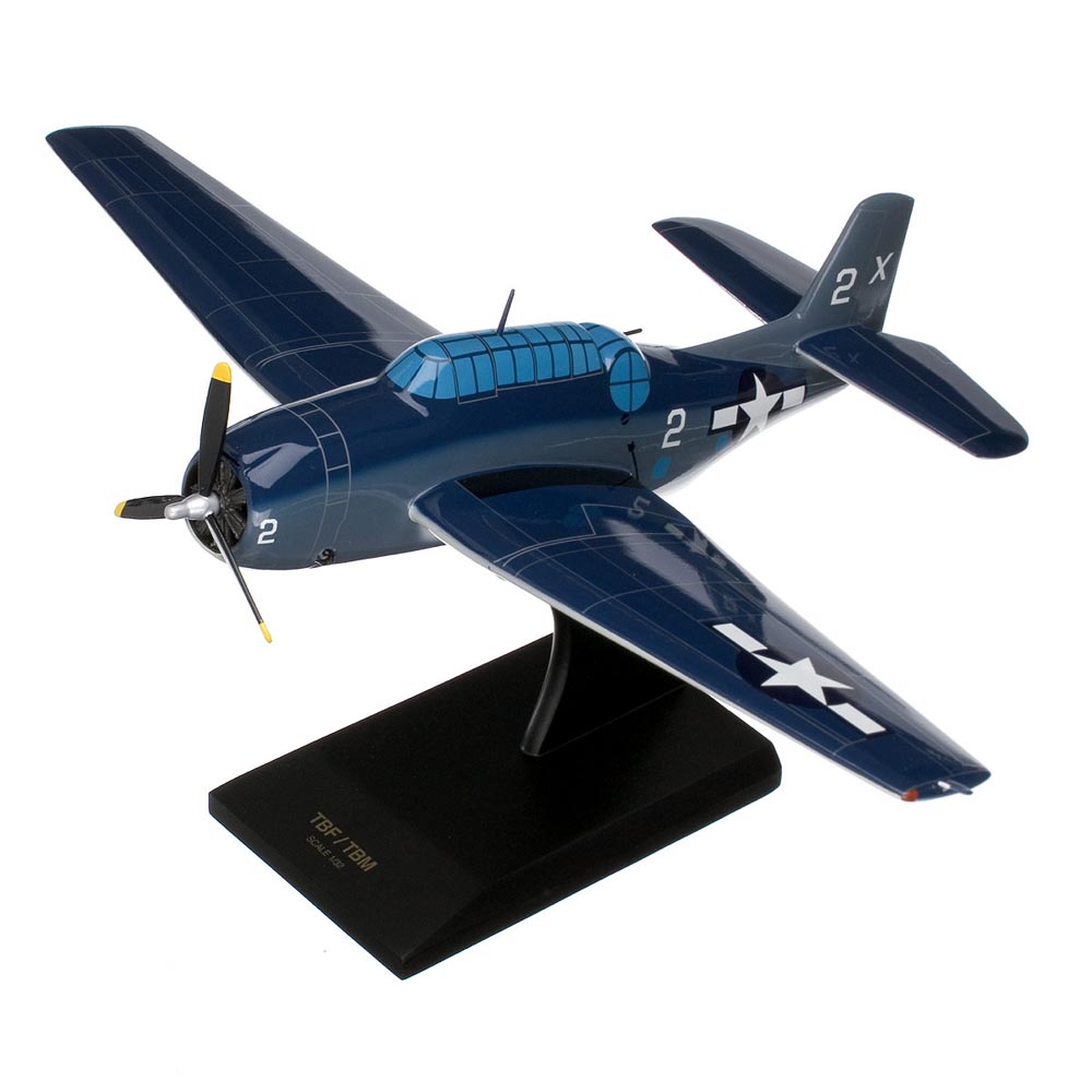 This high quality replica is handcrafted from mahogany and comes with a wooden base. 1/32 scale. Length is 12-3/4" and wingspan is 16-3/4". The Grumman TBF Avenger (designated as TBM by General Motors) was a torpedo bomber developed initially for the United States Navy and Marine Corps and was also used by a large number of air arms around the world. Grummans first torpedo bomber was the heaviest single-engine plane of WWII and it was the first to feature a new wing-folding mechanism intended to maximize storage space on an aircraft carrier. The Grumman TBF Avenger entered service in 1942 and first saw action during the Battle of Midway. On the afternoon December 7, 1941, Grumman held a ceremony to open a new manufacturing plant and display the new TBF to the public. Ironically, on that day, the Imperial Japanese Navy attacked Pearl Harbor, as Grumman soon found out. The plant was quickly sealed off to ward against possible enemy action. By June 1942, a shipment of more than 100 planes was sent to the Navy. On August 24, 1942, the next major naval battle occurred at the Eastern Solomons. With only the carriers USS Saratoga (CV-3) and Enterprise, the 24 TBFs present were able to sink the Japanese aircraft carrier Ryujo and claim one dive bomber, at the cost of seven planes. After hundreds of the original TBF-1 models were built, the TBF-1C began production. By 1943, Grumman began to slowly phase out production of the Avenger to produce F6F Hellcat fighters, and the Eastern Aircraft Division of General Motors took over, with these aircraft being designated TBM. Starting in mid-1944, the TBM-3 began production with a more powerful powerplant and wing hardpoints for drop tanks and rockets. The dash-3 was the most numerous of the Avengers with about 4,600 produced. However, most of the Avengers in service were dash-1s until near the end of the war in 1945. TBF/TBMs sank the two Japanese ""super battleships"", the Musashi and the Yamato. The Avengers played a major role in the American victory during World War II. |