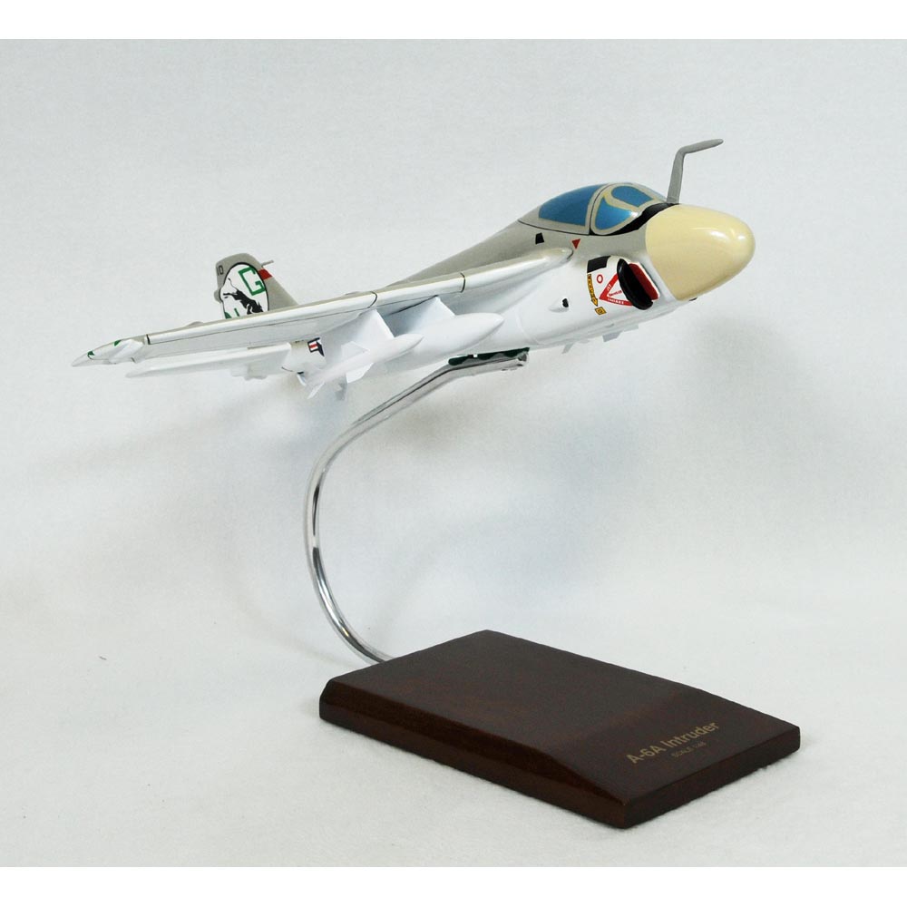 This high quality replica is crafted from resin and comes with a wooden base. Length is 13-1/2" and wingspan is 13-1/4". Scale is 1/48. When the United States Navy (USN) set out to replace the piston-engined World War II-era A-1 Skyraider, the new attack aircraft needed to be all-weather and carrier-based. In 1957, the contract was awarded to Grumman, and the twin-engined A-6 Intruder was developed. The prototype made its first flight on April 19, 1960. The Intruders career began in 1963 and would carry on for 34 more years. The A-6 was capable of low-level flying in all weather conditions, and its wings were very efficient at subsonic speeds. The aircrafts large, blunt nose and slender tail earned it a string of nicknames, including Double Ugly, The Mighty Alpha Six, Iron Tadpol, Drumstick and Pregnant Guppy. The Intruder was redesignated A-6A in the fall of 1962 and entered squadron service in February 1963. The A-6 became the Navys and Marine Corps principal medium and all-weather/night attack aircraft from the mid-1960s until the 1990s. The Intruder first saw combat during the Vietnam War, where it was used extensively against targets in Vietnam. The aircrafts ability to fly in any weather condition, long range and heavy payload of 8,170 kg made it invaluable during the war. However, its effectiveness in flying low and delivering its payload made it especially vulnerable to anti-aircraft fire. In the eight years that the A-6 was used during the war, the USN and USMC (United States Marine Corps) lost 84 aircraft to all causes. Ten were shot down by surface-to-air missiles, 2 were destroyed by Red Chinese Shenyang J-6s, 16 were lost to operational causes, and the remaining 56 were lost to conventional ground fire and anti-aircraft artillery. |