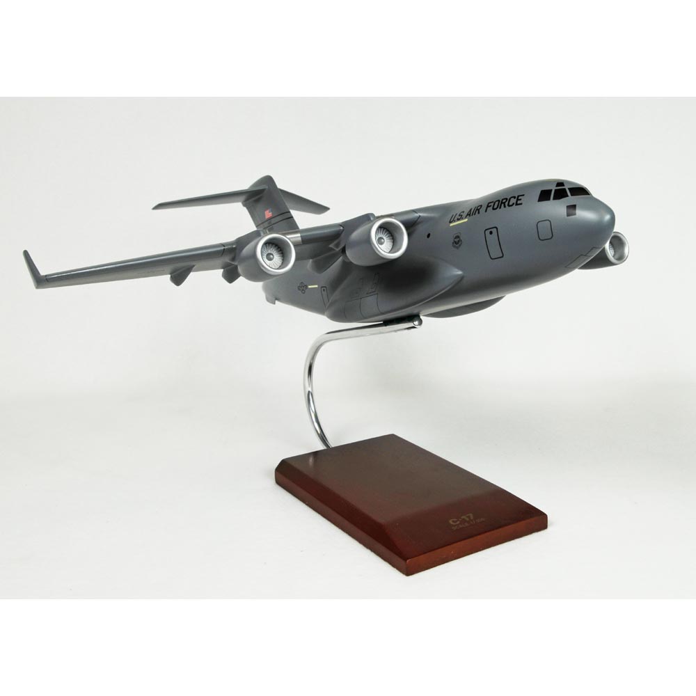 This high quality replica is handcrafted from mahogany and comes with a wooden base. Length is 12-3/4" and wingspan 12-1/4". The Boeing C-17 Globemaster III is the newest, most flexible airlift aircraft to enter the United States and Western Air Forces. This aircraft is designed to fulfill airlift needs well into the next century - carrying large combat equipment and troops or humanitarian aid across international distances directly to small austere airfields anywhere in the world. The C-17 is also able to perform theater airlift and airdrop missions when required. The C-17 takes its name from two previous heavy lifter aircraft, the C-74 Globemaster and the C-124 Globemaster II. In January 1995, the Air Force declared the first C-17 squadron operational. Since then the fleet has amassed more than 200,000 flying hours. In May 1995, the C-17 received the prestigious Collier Trophy, symbolizing the top aeronautical achievement of 1994. In 1998, eight C-17s completed the longest airdrop mission in history, flying more than 8,000 nautical miles from the United States to Central Asia, dropping troops and equipment after more than 19 hours in the air. In February 1999, President Bill Clinton presented the Malcolm Baldrige National Quality Award for business excellence to Boeing Airlift and Tanker Programs, maker of the C-17. During normal testing, C-17s set 22 world records, including payload to altitude time-to-climb and the short takeoff and landing mark, in which the C-17 took off in less than 1,400 feet, carried a payload of 44,000 pounds to altitude, and landed in less than 1,400 feet. |
