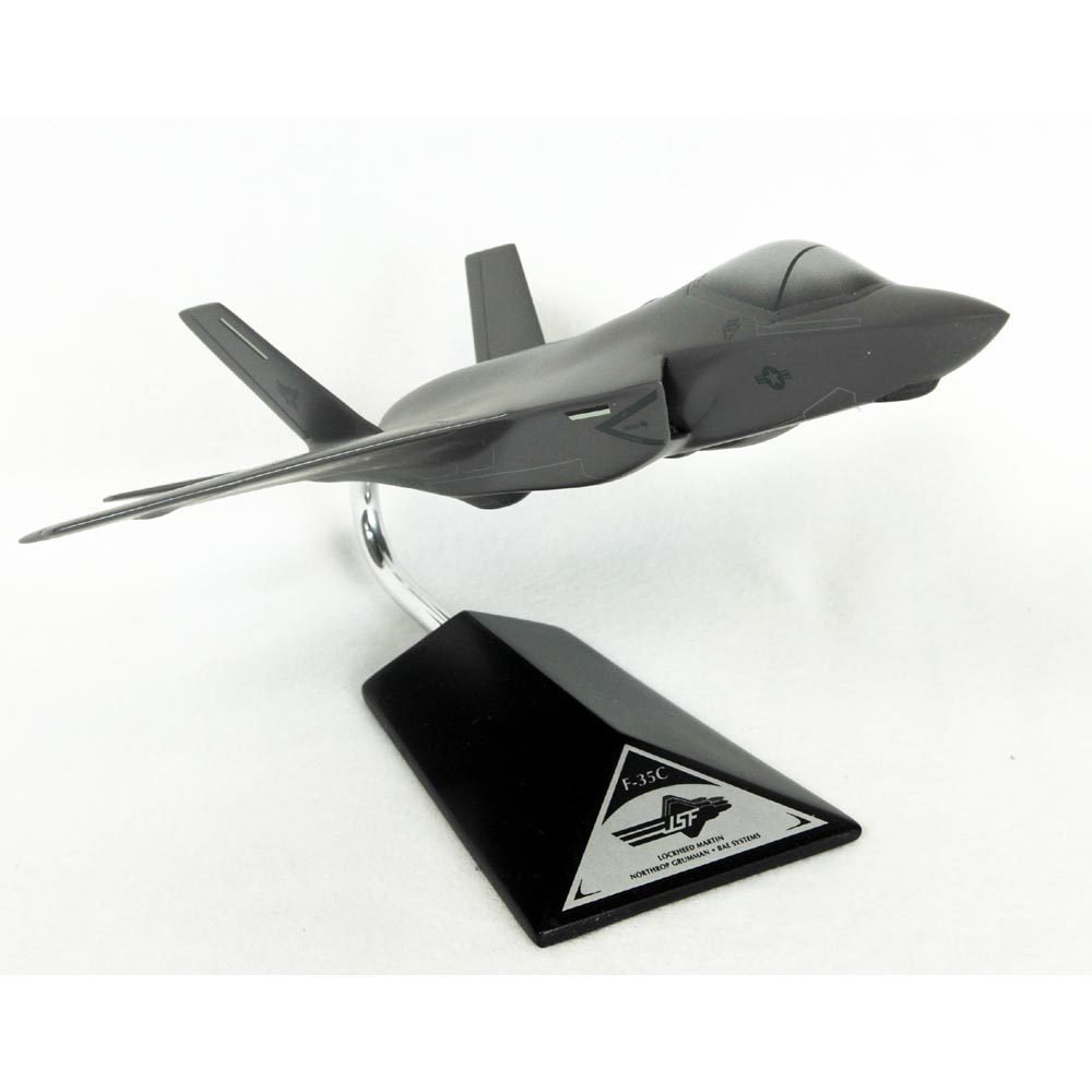 This high quality replica is crafted from resin and comes with a wooden base. Length is 12-3/4" and wingspan 10 1/2". 1/48 scale. The Joint Strike Fighter (JSF) is a joint, multinational acquisition program for the United States Air Force, Navy, Marine Corps and eight cooperative international partners. It was created to replace various aircraft while keeping development, production and operating costs down. The objective is to develop a technically superior and affordable fleet of aircraft that would be capable of a wide range of missions in a variety of theaters. On October 26, 2001, the contract was awarded to Lockheed Martin, whose X-35 experimental aircraft outperformed Boeings X-32. The F-35 Lightning II, which is descended from the X-35, has become synonymous with the JSF program. It is a single-seat, single-engine, stealth-capable military strike fighter that can perform multiple roles such as close air support, tactical bombing and air-to-air combat. Expected to be the largest military aircraft procurement ever, the F-35 will replace a wide range of aging fighter and strike aircraft. The JSF aircraft design has three variants: conventional takeoff and landing (F-35A), short takeoff and vertical landing (F-35B), and carrier-based (F-35C). The F-35C naval variant will have a larger, folding wing and larger control surfaces for improved low-speed control, and stronger landing gear for the stresses of carrier landings. The larger wing area provides increased range and payload, with twice the range on internal fuel compared with the F/A-18C Hornet, achieving the same goal as the heavier F/A-18E/F Super Hornet. The US Navy intends to buy 480 F-35Cs to replace the Hornets. It will also serve as a stealthier complement to the Super Hornet. The F-35C is expected to be available beginning in 2012. Our F-35C Lightning II JSF/CV scale model is a faithful reproduction of the original aircraft. Handcrafted and hand-painted, it boasts of accurate details that are protected by a coat of clear lacquer. All models undergo various stages of quality control before reaching our customers. More than just a replica, it is a true work of art. The F-35C JSF/CV model aircraft is perfect as an addition to a growing collection or as an exquisite gift to a loved one. |