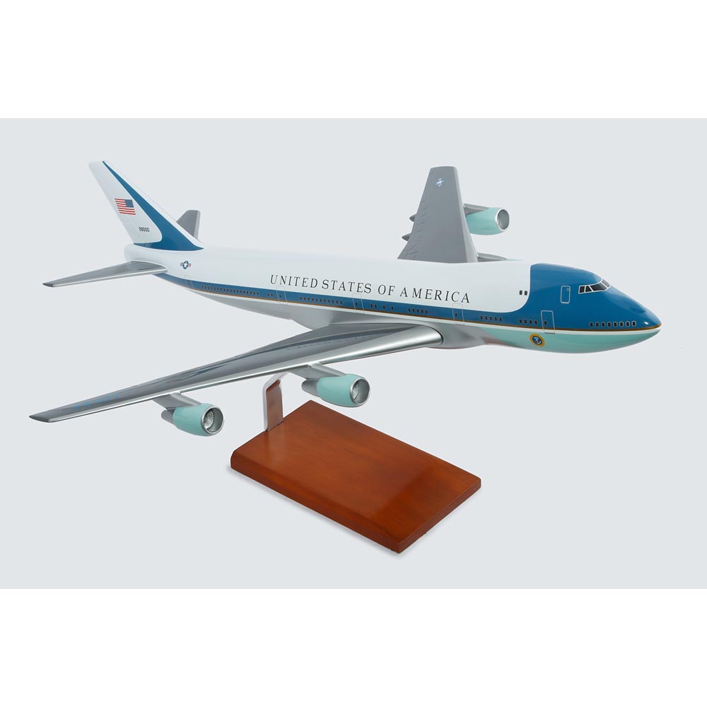 This high quality replica is crafted from resin and includes a wood and metal display stand. Length is 28" and wingspan 24". Scale is 1/100. The VC-25 (also known as 747-200) is most notable for its role as Air Force One, the callsign of any U.S. Airforce aircraft carrying the President of the United States. The VC-25 differs from the standard Boeing 747 relating to interior dimensions and security features. The VC-25 is capable of flying 7,800 miles without refueling and can accommodate more than 79 passengers. Each VC-25 cost approximately US$325 million. The VC-25 replaced the VC-137 as the mainstays of the Airforce One fleet. On some occasions, the planes are used to transport the Vice President of the United States, for which service they adopt the callsign Airforce Two. These aircraft are maintained and operated as military operations. The VC-25 can also be operated as a military command center in the event of an incident such as a nuclear attack. Operational modifications include aerial refueling capability and anti-aircraft missile countermeasures. The VC-25 has also been used to transport deceased former presidents. The remains of Ronald Reagan and General Ford were transported by SAM 28000 and 29000 respectively to Wsahington for their state funerals, and then on to their final resting places. The VC-25 replaced 707 as presidential aircraft of John F. Kennedy in 1990. |