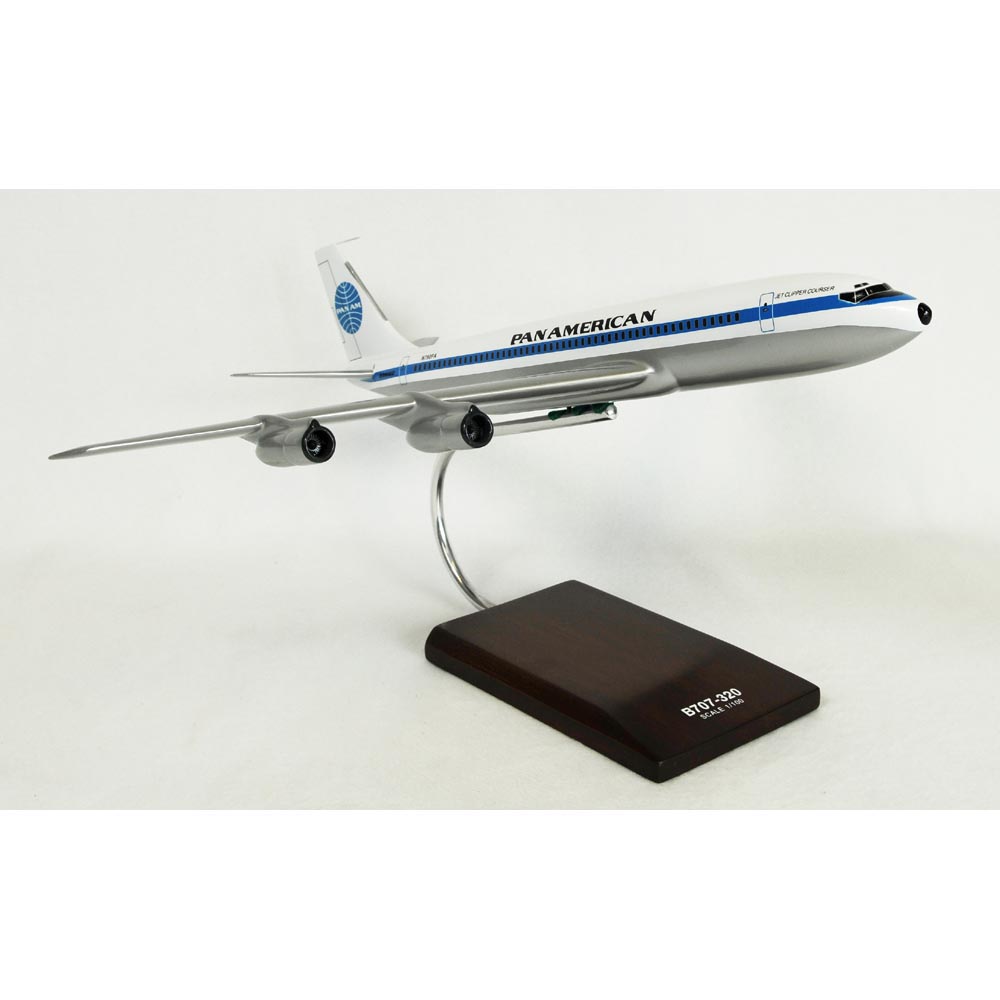 Length is 18.5" and wingspan is 17.5". Scale is 1/100. The Boeing 707-320 civilian variant of the 707 is a stretched version of the turbojet-powered original model. The 707-320s maiden flight was on January 11, 1958. It incorporates JT4A-3 turbojets which produce 15,800 lbst each. The interior of the 707-320 allows seating for up to 189 passengers. The longer wing could carry more fuel, increasing range by 1,600 miles and allows the it to operate as a transoceanic aircraft. There were 60 turbojet -320s produced. |