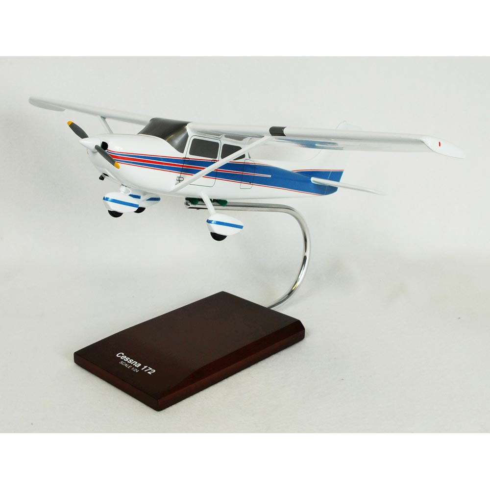 This high quality replica is crafted from resin and comes with a wooden base. Length is 12" and wingspan is 16-1/2". Scale is 1/24. The four-seat single-engine high-wing Cessna 172 Skyhawk is the most successful mass produced light aircraft in history. It is also possibly the most popular flight trainer in the world. Over 40,000 172s have been built, more than any other Western aircraft. First delivered in 1956, it is still in production as of 2007. The Skyhawks main competitors include the Beechcraft Musketeer, the Grumman AA-5 series, the Piper Cherokee, and the Diamond DA40. The prototype first flew in November 1955. The 172 was an overnight sales success, with over 1,400 built during its first full year of production in 1965. The 172 began as a relatively simple tricycle landing gear upgrade from the taildragger Cessna 170, with a fairly basic level of standard equipment. Early models looked almost identical to the 170, with the same straight aft fuselage and tall gear legs, although the 172 sported a straight vertical tail while the 170 had a rounded fin and rudder. Later versions incorporated revised landing gear and a lowered rear deck that allowed an aft window, marketed as “Omni-Vision”. The final aesthetic development in the mid-1960s was the sweptback tail which is still in use today. A variant of the 172, the T-41 is used as a trainer with the United States Air Force and Army. Because of its high-wing design, stability at low airspeeds, and relatively low stall speed, the aircraft is an excellent platform for search and rescue operations and is the primary platform for the Civil Air Patrols operations. The US Border Patrol also uses a fleet of 172s for aerial surveillance along the Mexican-American border. |