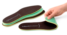 Feature a three-layer custom design for foot injuries. Also effective for walkers. Not recommended for running or standing for long periods. Consult your health professional prior to use if you have a medical condition. Top fabric is high-wicking and low friction. The two underlayers are special polymers: one soft and conforming, and the second more stiff for improved shock absorption. At 5/16" thick, inserts require footwear with sufficient room. Users should try insoles in new footwear before purchasing to insure proper fit. Can be trimmed easily for exact fit. Instructions included. How Do They Absorb So Much Shock? The patented ShockBlockers® Insole Inserts, available to the general public, combine innovative designs and materials. How can something that looks as simple as our insole inserts be so complex? Explains Mike Dennis, President of ShockBlockers Technology LLC & Oregon Aero, Inc.: “When we run, walk or stand, we generate shock, which is mechanical energy. This shock can cause pain as well as stone bruises, shin splints and compression fractures. The goal of ShockBlockers® Insole Inserts is to reduce the negative effect of this mechanical energy. The total energy generated can’t be reduced, but it can be converted into a form of energy that is more easily manipulated, in this case, into heat. A unique molecule in the ShockBlockers® Insole Inserts polymer creates this conversion. The heat created is then captured by the proprietary fabric upper layer of the insert. This fabric is woven in such a way that it also captures perspiration; the heat and perspiration are wicked to the outer edges of the insole insert where they are released and dissipated through evaporation. An additional material in the fabric reduces friction between the foot and the insole insert, preventing blisters." |