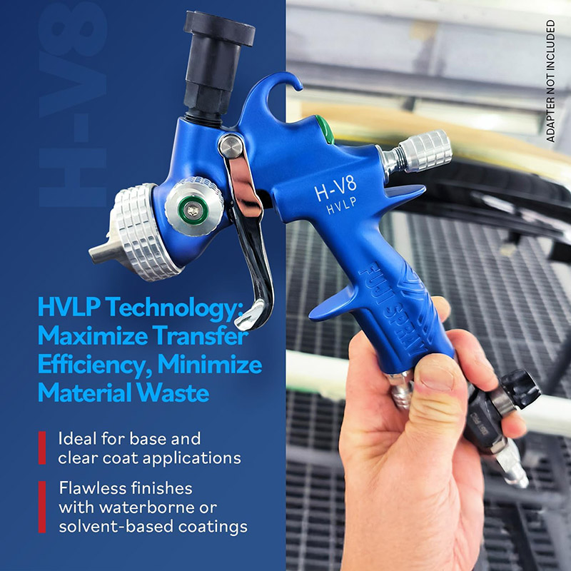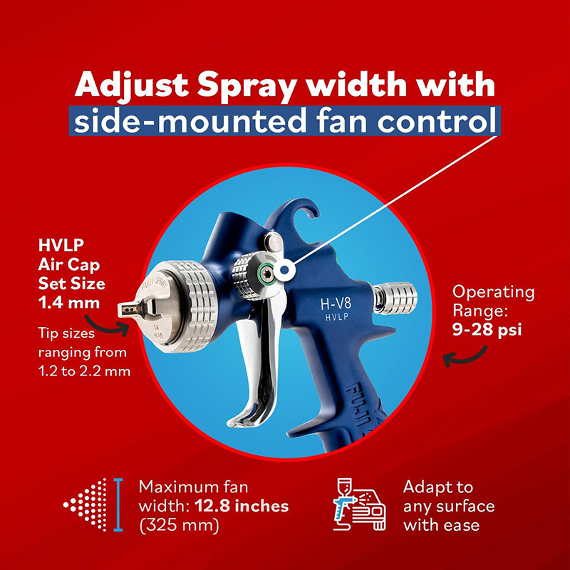 | Best suited for base and clear coat applications, the H-V8™ features a precise side-mounted fan pattern control. The H-V8™ has few internal components, forged aluminum spray gun body with anodized fluid passages, and an optimized HVLP air cap resulting in a soft spray pattern. |