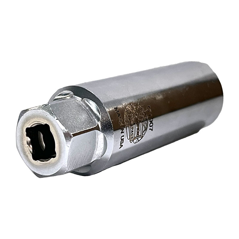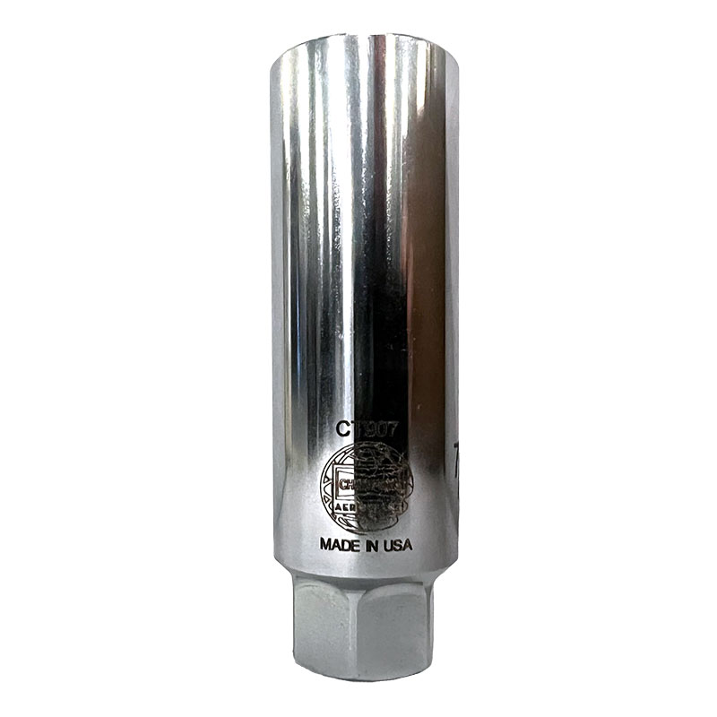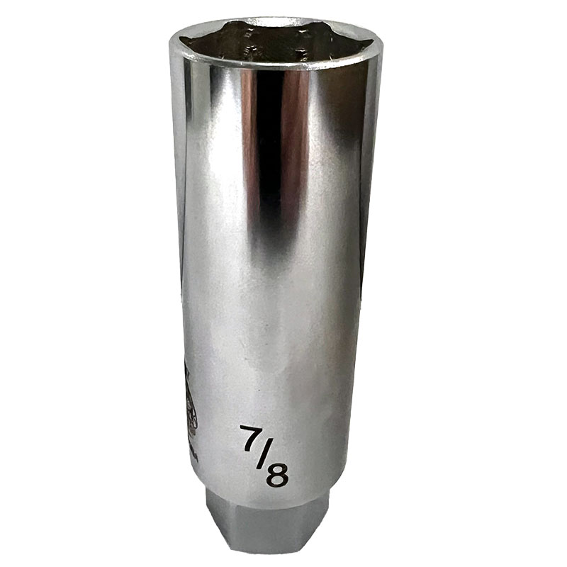 Socket designed for use with shielded aviation spark plugs. Use with 3/8" square drive wrenches. Built-in magnet holds plugs. Chrome plated. 3-1/2" long, 7/8" deep hex socket. |
