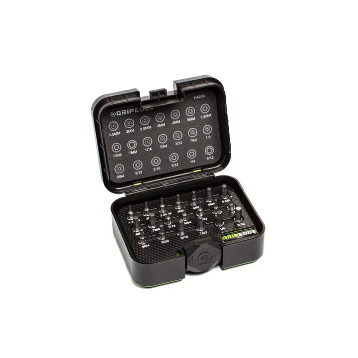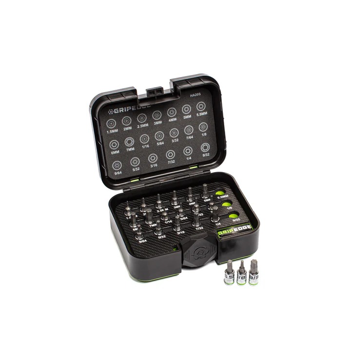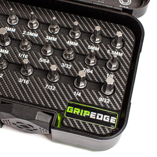 | Introducing the GRIPEDGE 20-PC 1/4" Drive SAE and Metric Hex Driver Set with Rounding Prevention Technology (R.P.T.). These precision-machined S2 steel bits are designed to deliver up to 50% more torque on good fasteners and up to 400% more on damaged ones. The patented bi-directional geometry prevents rounding, ensuring reliable performance. The set includes sizes from 1.5 to 7 MM and 1/16 to 9/32”, perfect for automotive and industrial applications. Each socket features clear-size markings and nickel chrome plating for corrosion resistance, all housed in a premium case with a removable foam insert. |