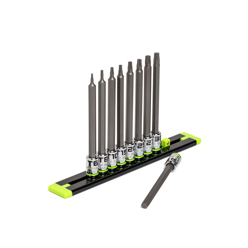Introducing the GRIPEDGE 9-PC 1/4" Drive Long Star driver set, featuring R.P.T. (Rounding Prevention Technology). These star bit sockets provide up to 50% more torque on good fasteners and 400% more torque on damaged fasteners compared to standard tools. Precision machined from S2 steel, they offer enhanced strength, durability, and corrosion resistance. The set includes sizes from T6 to T40, ideal for most automotive applications, and comes on a premium aluminum socket rail. Each socket has a 4" overall length for improved access to hard-to-reach areas. |