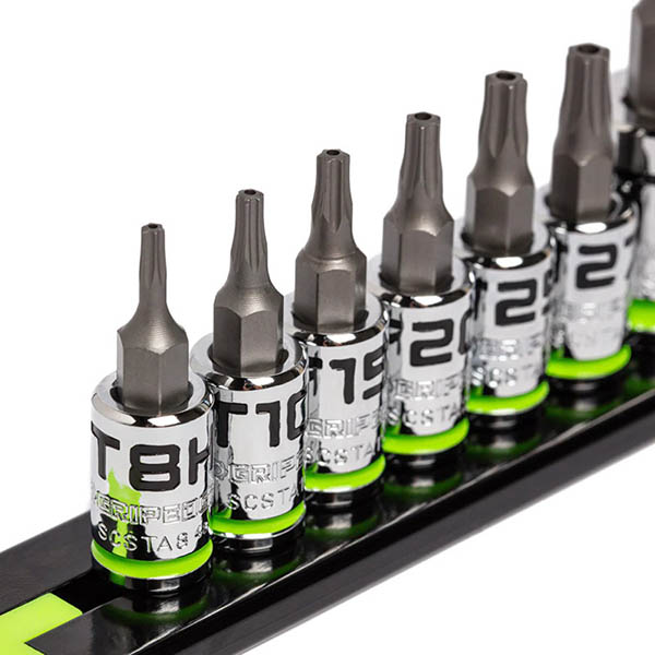 | Introducing the GRIPEDGE 10-PC Tamper Proof Star Driver Set with Rounding Prevention Technology (R.P.T.). Designed to replace standard tools, these precision-machined S2 steel bits offer up to 50% more prevention torque on good fasteners and up to 400% more torque on damaged fasteners. The patented bi-directional geometry prevents rounding and allows for the removal of compromised fasteners, which can be re-used if needed. Each bit features oversized, roll-stamped, and ink-filled size markings for easy visibility and is coated for corrosion resistance. The set includes sizes from T8H to T50H, ideal for most automotive applications, and comes on a premium aluminum socket rail. |