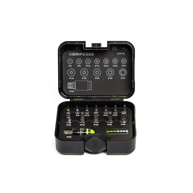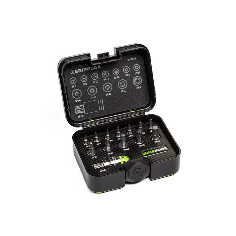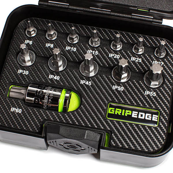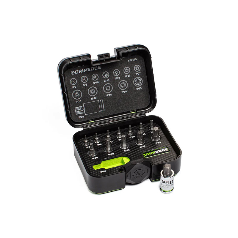 Introducing the GRIPEDGE 13-PC Star Plus Driver Set with Rounding Prevention Technology (R.P.T.). These bit sockets, made from precision-machined S2 steel, offer up to 50% more torque on good fasteners and 400% more on damaged ones compared to standard tools. The patented bi-directional geometry prevents rounding and allows the removal of compromised fasteners. Features include oversize, roll-stamped ink-filled size markings, nickel chrome plating for corrosion resistance, and a premium plastic case with a removable foam insert. Sizes range from IP6 to IP60, ideal for most automotive applications. |