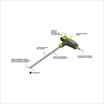 GRIPEDGE R.P.T. (Rounding Prevention Technology) T-Handles are designed to replaced standard star tools. R.P.T. prevents the rounding of good star fasteners whilst being able to remove extremely compromised star fasteners. The unique, patented & Bi-directional geometry delivers up 50% more prevention torque on good fasteners vs standard tools, whilst applying up to 400% more torque on damaged fasteners vs standard tools. Compromised fasteners can be re-inserted in a pinch if a suitable replacement is not available. Each bar is precision machined from S2 steel for increased strength and durability as well as coated for increased corrosion resistance. Each T-Handle is uniquely designed and over molded for additional comfort. |