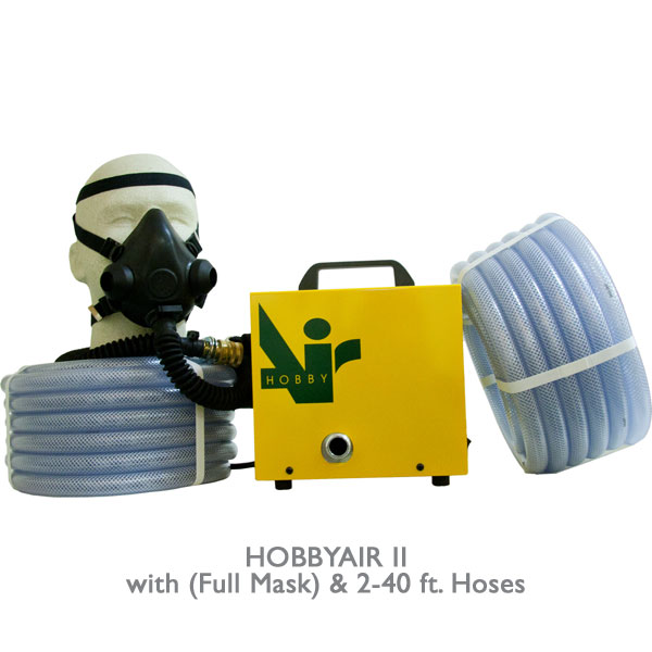 Hobbyair 1 has 40' of hose, and the Hobbyair 2 has 80' of hose to the mask.