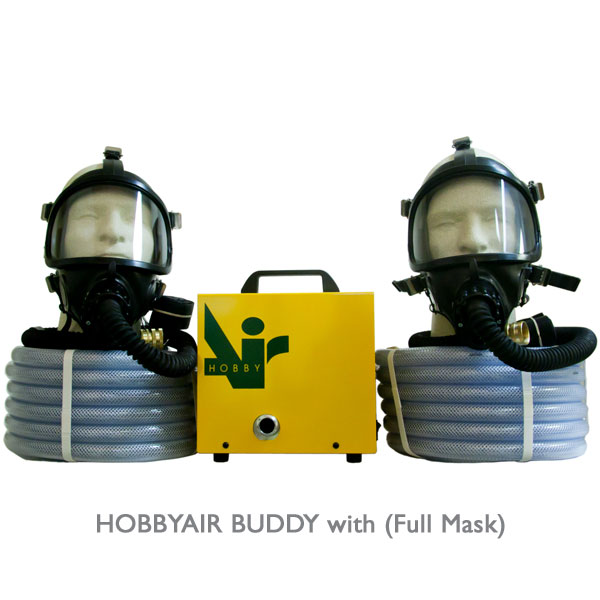 The Hobbyair Pro 1 is a fresh air breathing system specifically designed for the amateur painter which allows only fresh air to reach the user's lungs. It features a comfortable, lightweight facemask with beltline hook, simple snap together fittings, and is very affordable. Includes the pump unit with two stage, single speed, air bypass type motor, mask, belt and 40 foot delivery hose, fittings, filter, cord and case. The Buddy System Hobbyair is designed for two people and includes two 40 ft. delivery hoses. 1 yr warranty. Excellent for use in homebuilt aircraft construction and painting. |