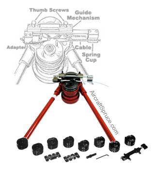This portable, hand-operated roll type swaging machine will swage MS type terminals onto galvanized and stainless steel cables from 1/16" diameter up to and including 3/16" dia. Includes machine, a full set of roll dies, terminal gauges and feed guide adapters and instructions in a steel carrying case. Wt. 64 lbs. New manufacture. All replacement parts available. Special order