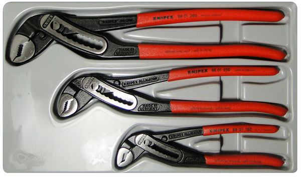 Knipex 3pc Alligater Water pump Pliers 7", 10", 12" More output and comfort compared to conventional water pump pliers of the same length: 9-notch adjustment positioning for 30 % more gripping capacity. With good access to the work piece due to slim size in the head and joint area. Self-locking on pipes and nuts: no slipping on the workpiece and low handforce required. Gripping surfaces with special hardened teeth, teeth hardness approx. 61 HRC: low wear and stable gripping. Box-joint design: high stability because of the double guide and robust construction, insensitive to dirt; particularly suitable for outdoor work. Guard prevents operators’ fingers being pinched. Chrome vanadium electric steel, forged, oil-hardened. |