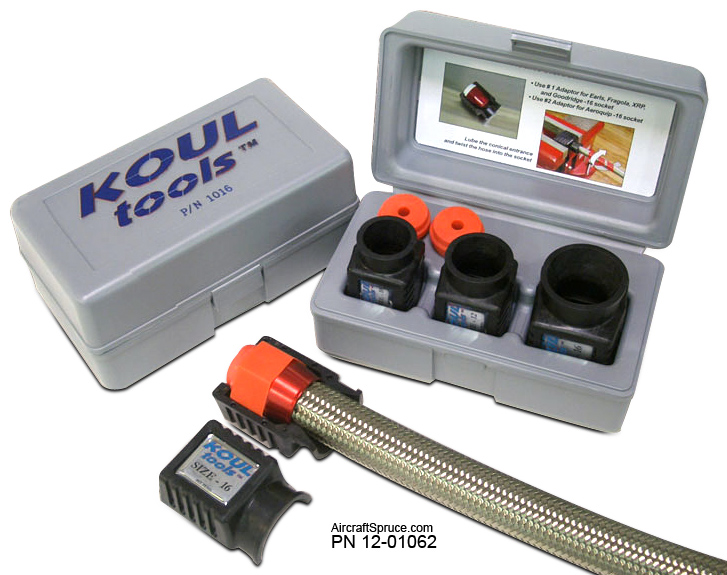 The Large kit contains the capsules to install -10, -12, -16 hose into their respective sockets. To accommodate all the different manufacturer’s fittings, spacers and sleeves are required to tighten up some of the sockets within the capsule. For the tool to perform at its best, the socket needs to be a snug fit into the funnel. In the 1016 kit, all the -16’s except Russell’s require the sleeve and a rear spacer. See the instructions in the case for the proper spacer number. Most of the -10’s and 12’s* will use a spacer. Not for use with Teflon™ style hose. * -12 is a stainless washer.