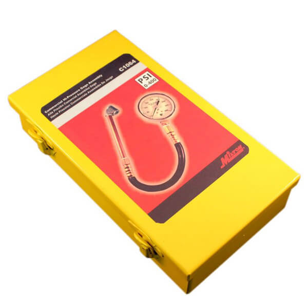 This dual chuck stem pressure gauge assembly kit includes a flexible hose whip and metal carrying case. Pressure range of 0 - 400 PSI. |