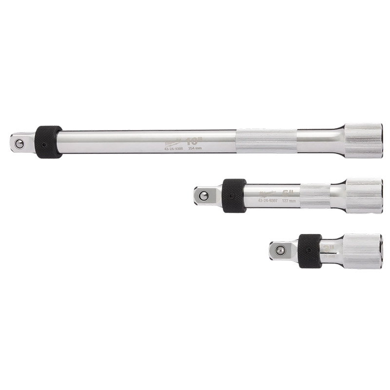 | Our 3PC 1/2" Drive Locking Extension Set offers the most control and is more secure in tight applications. These extensions feature the largest knurling surface on both the shaft and female drive end allowing precision control when hand-tightening fasteners or working with oily materials. In addition to keeping the socket secure with a durable knurled locking collar, these extensions feature a detent hole to increase engagement with the ratchet head for better overall retention. The set includes a durable compact storage rack designed to optimize drawer space for long-term use. The chrome plating on the extensions offers corrosion and rust protection. All Milwaukee® Mechanics Hand Tools are backed by a lifetime guarantee. |