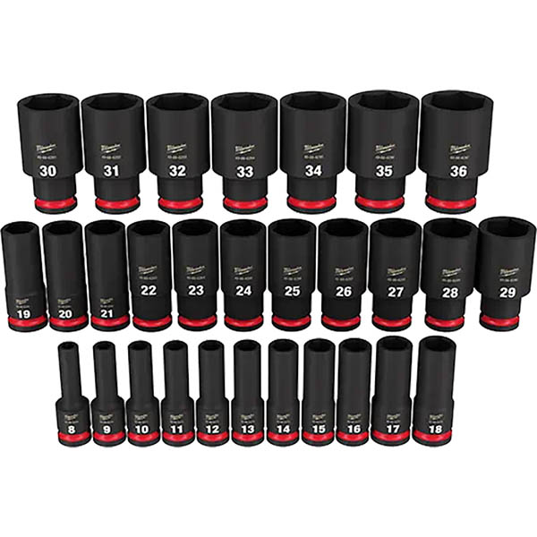 • Optimized for use with 1/2" drive impact wrenches, drivers, ratchets, and adapters Kit includes 29 Deep Metric sockets. The following sizes are included: 8, 9, 10, 11, 12, 13, 14, 15, 16, 17, 18, 19, 20, 21, 22, 23, 24, 25, 26, 27, 28, 29, 30, 31, 32, 33, 34, 35, 36