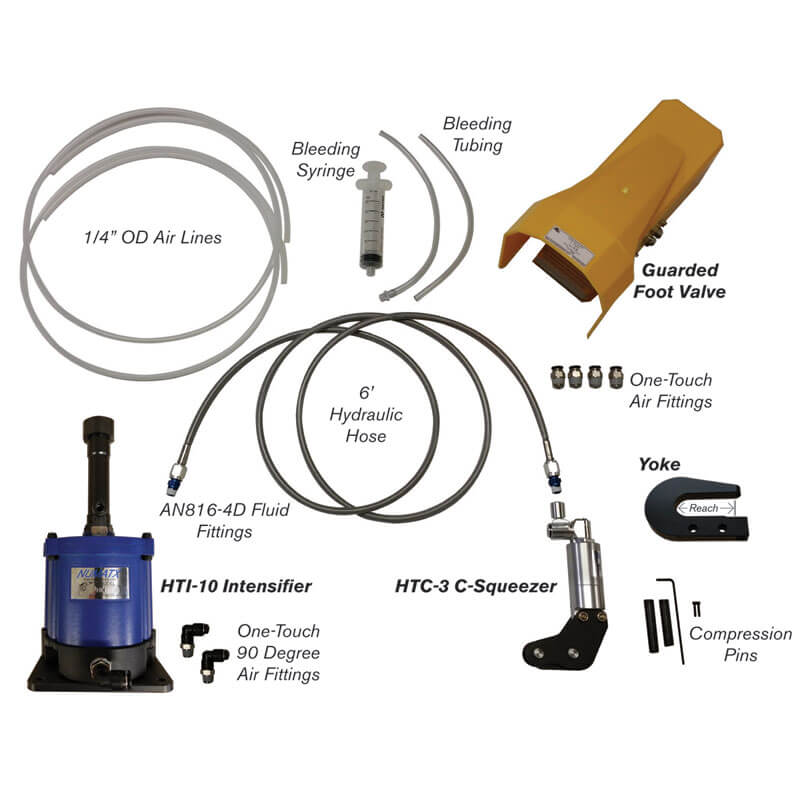 The Numatx HTS-C3K C-Squeezer System is a hydraulically operated hand held tool, designed to squeeze up to 1/8" diameter aircraft grade rivets (AD alloy). This unit is hydropneumatic operated (also known as pneudraulic). The system is comprised of an HTC-3 hand-held C-Squeezer unit and an HTI-10 Pressure Intensifier. The fully hydraulic C-Squeezer offers the advantages of decreased weight, smaller size, and constant force when compared to traditional pneumatic only squeezers. This reduces operator fatigue, allows for use in more confined areas, and improves control of the s2queezing action (feathering operation). The units are built from high-quality aircraft grade materials, with parts made on CNC machining centers and features held to close tolerances, for years of dependable operation. |