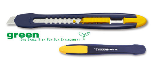 Auto-Lock-featured standard-duty model with a pocket clip/blade snapper. For both right- and left-handed uses. Handle and all plastic parts made from 100% recycled materials. Easy disassembly for next recycling. The ES-1 is a Japanese Eco-marked product authorized by JEA, and conforms to the Japanese law on promoting green purchasing. 9mm. |