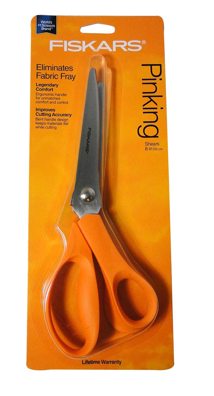 These orange handled pinking shears keep your projects from unraveling at the seams. Ergonomic handles give comfort and control, extended lower blade to help lift fabric while cutting. Adds functional pinking edge to prevent fabric fraying. Tested to ensure clean cutting even through multiple layers of cloth to the tip.