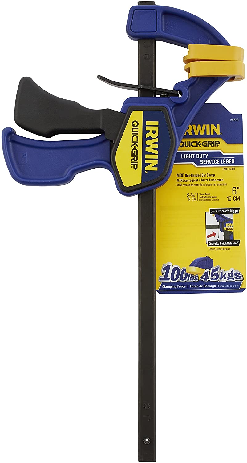 From the makers of Vise-Grip tools comes the amazing new Quick-Grip bar clamp. The unique pistol-grip handle lets woodworkers hold the clamp and adjust jaw pressure with just one hand. One finger unlocks the Quick-release trigger. Features: positive locking action to hold work tight, strong, lightweight high-tech construction, instant adjust- able clamping pressure, large, pliable pads that won't mar work, and a variety of jaw openings. It will "single- handedly" change the way you think about bar clamps |