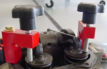 These simply bolt to the head and the knurled knob screws down to compress the valve spring allowing the shaft to be slid out with no spring pressure. |