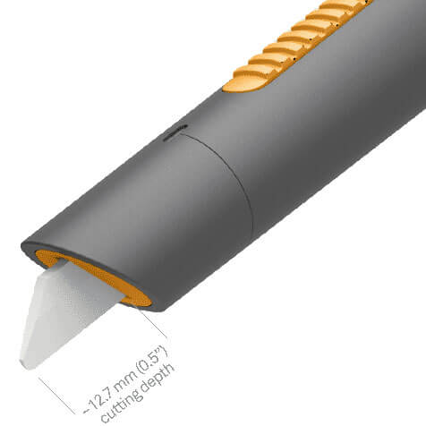 Three-position manual pen cutter includes one replaceable Slice ceramic safety blade. Patented handle with rubberized slider button limits the amount of exposed ceramic-blade to further reduce injuries. Three positions including fully-retracted. Patented high-tech double-sided Slice ceramic blade designed to reduce injuries by incorporating a safer rounded-tip. Sharpness level up to 10x longer than steel. Measures 135 mm L x 18 mm diameter (5.3 in L x 0.75 in diameter). |