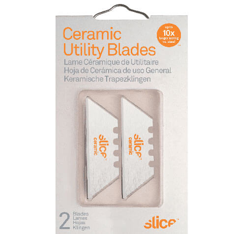 Slice patented ceramic utility blades fits most standard utility knife handles. Each pack contains two (2) rounded-tip ceramic Slice ceramic utility blades. Each blade measures approximately 63 x 19 x 0.8 mm and weights 3 gm (2.5 x 0.75 x 0.3 in - 0.1 oz). |