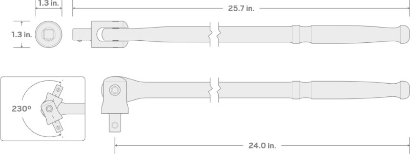 230º Pivoting Head The head pivots smoothly and continuously through a 230-degree arc. An internal spring controls the tension of the head, allowing it to hold its position while you work. ![]() Parts and Assembly The breaker bar head is made of AISI 4140 steel and heat treated to be stronger and more ductile than the handle. ![]() Stronger External Head Our external head design better resists spreading, twisting, or fracturing than an internal head design. ![]() Proof Torque Our breaker bars exceed industry standards for Proof Torque, a measure of strength verified by a single-cycle test that applies torque until the specified value is reached without failure or any permanent deformation. Data from: “Category 10, Type 1, Class 1 Handles, Hinged.” ASME B107.110-2019. ![]() Working Handle Length We name our ratchets and breaker bars according to their effective working length, which is measured from the center of the drive tang to the end of the handle. ![]() Sleek, Comfortable Handle The finger groove has pronounced interior edges for traction and control for any finger placement. The pommel at the end of the handle keeps your hand from slipping off and is rounded for comfort. ![]() |
