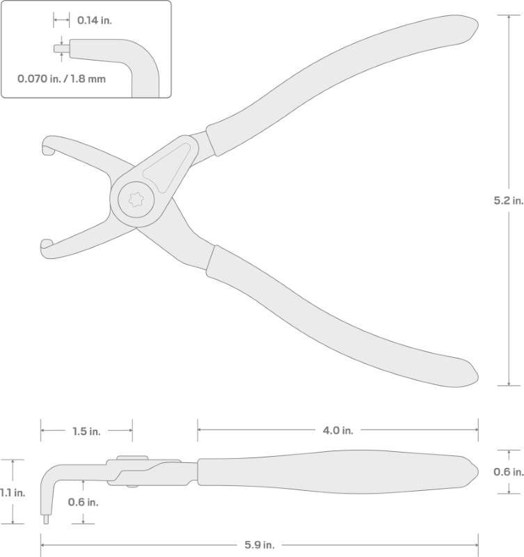 Forged Jaws and Refined Tips for Strength and Control Angled for Control The tips are angled to securely hold the ring with a downward pressure, preventing the ring from slipping off. ![]() Hardened for Strength The tips and jaws are made from two different materials, each optimized for its function. Hardened bearing steel is used for the tips to enhance shear strength. ![]() Crimped-In Cylindrical Tips The tips are smooth, straight, and free of burrs to create a consistent, controlled grip on the ring. A crimp at the end of each jaw permanently holds the tips in place. ![]() Uncompromised Design for a Single Purpose These pliers are built for a single, dedicated purpose. By keeping things simple and free of unnecessary features, they remain lean and optimized for the job. Just grab them and go—no adjustments, loose parts, or compromises. ![]() Secure Hold for Reduced Twisting The combination of the outward angled tips and the flat surface at the base of the tips creates a very secure hold on the ring which reduces twisting and the risk of slipping off. Long, Slim Jaws for More Access The long, slim jaws and compact joint allow you to reach deep into a cavity or bore. ![]() Spring-Loaded, Bolted Joint The two forged handles are permanently bolted together and spring-loaded. The spring is oiled and housed inside the joint, keeping it hidden and protected while providing smooth, quiet operation. Note: The joint is not adjustable or serviceable. ![]() Broad, Comfortable Handles The forged handles get wider in the center and are coated with vinyl grips to improve control and comfort. ![]() Clear Markings The tip size and function are clearly laser-marked on the pliers for quick reference. ![]() Parts and Materials A. Tips Made of E52100 bearing steel hardened to 47–53 HRC with nickel plating. B. Jaws Made of 1045 steel hardened to 37–43 HRC with black oxide finish and a light coating of rust inhibitor. C. Pivot Screw Made of 1015 steel with nickel plating. Non-removable. D. Handle Grips Made of single-layer vinyl. E. Internal Spring Made of 1065 spring steel. Oiled. ![]() |
