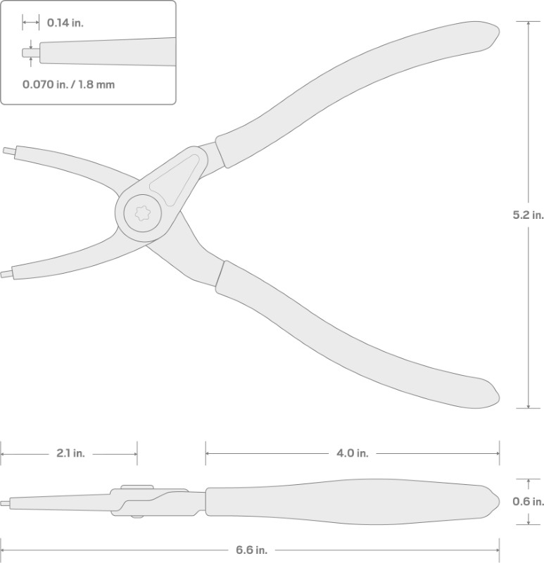 Forged Jaws and Refined Tips for Strength and Control Angled for Control The tips are angled to securely hold the ring with a downward pressure, preventing the ring from slipping off. ![]() Hardened for Strength The tips and jaws are made from two different materials, each optimized for its function. Hardened bearing steel is used for the tips to enhance shear strength. ![]() Crimped-In Cylindrical Tips The tips are smooth, straight, and free of burrs to create a consistent, controlled grip on the ring. A crimp at the end of each jaw permanently holds the tips in place. ![]() Uncompromised Design for a Single Purpose These pliers are built for a single, dedicated purpose. By keeping things simple and free of unnecessary features, they remain lean and optimized for the job. Just grab them and go—no adjustments, loose parts, or compromises. ![]() Long, Slim Jaws for More Access The long, slim jaws and compact joint allow you to reach deep into a cavity or bore. ![]() Spring-Loaded, Bolted Joint The two forged handles are permanently bolted together and spring-loaded. The spring is oiled and housed inside the joint, keeping it hidden and protected while providing smooth, quiet operation. Note: The joint is not adjustable or serviceable. ![]() Broad, Comfortable Handles The forged handles get wider in the center and are coated with vinyl grips to improve control and comfort. ![]() Clear Markings The tip size and function are clearly laser-marked on the pliers for quick reference. ![]() Parts and Materials A. Tips Made of E52100 bearing steel hardened to 47–53 HRC with nickel plating. B. Jaws Made of 1045 steel hardened to 37–43 HRC with black oxide finish and a light coating of rust inhibitor. C. Pivot Screw Made of 1015 steel with nickel plating. Non-removable. D. Handle Grips Made of single-layer vinyl. E. Internal Spring Made of 1065 spring steel. Oiled. ![]() |