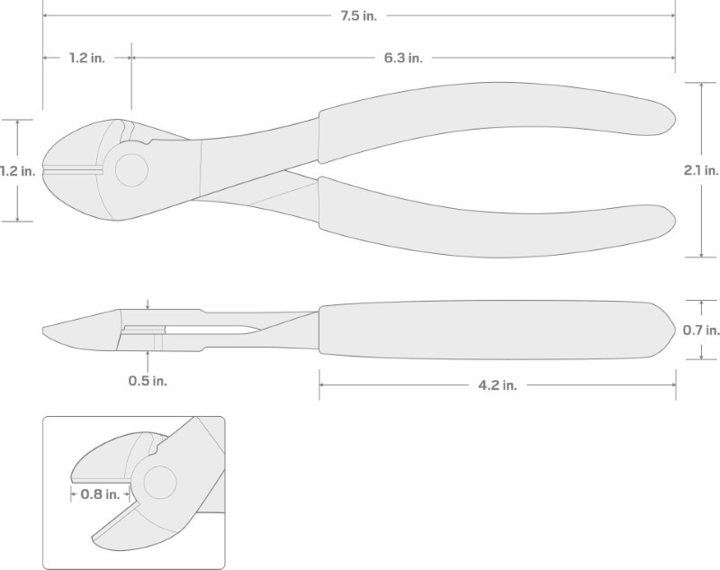 ![]() ![]() ![]() ![]() Clean Cut with Minimal Effort Machining the blades to an optimized 82-degree angle allows them to be strong yet sharp, producing a satisfyingly smooth, clean cut that requires minimal effort. ![]() INDUCTION HARDENED: After the full pliers have been heat treated, a secondary induction-heating process hardens just the blades to 58–64 HRC, making them extremely durable and able to cut tougher materials. KNIFE-TO-KNIFE: Comprised of two opposing blades that meet in the center, it is an extremely reliable cutting method, especially for harder wires. For a clean, low-effort cut, it requires a high level of manufacturing expertise to produce the near perfect alignment of the blades. When this cannot be consistently achieved, some manufacturers may turn to a less effective knife-and-anvil design (one knife blade, one blunted blade) that doesn't require such precise alignment. Cutting Capabilities ![]() Ergonomic Hand Position and Clearance for Fingers "Diagonal" describes the offset of the blades relative to the plane of the handles, providing a more comfortable hand and wrist position for most operations and clearance for fingers when working close to adjacent surfaces. ![]() Wide Profile Handles Generous in overall size, the handles have an extra-wide, gently rounded profile that creates a large, smooth contact surface. This spreads out the pressure against your hand so you can comfortably squeeze as hard as needed. ![]() Lean and Practical Grips Single-layer vinyl grips offer a bit of comfortable cushion and provide a smooth, yet nonslip surface. They're slim, not thick and bulky, so they stay out of the way when space is tight and are always easy to handle, even with gloves on. ![]() Non-absorbing and resistant to most common fuels, lubricants, and cleaners. Won't get soft or sticky over time. Easy to wipe clean. |