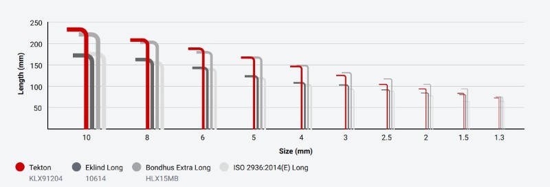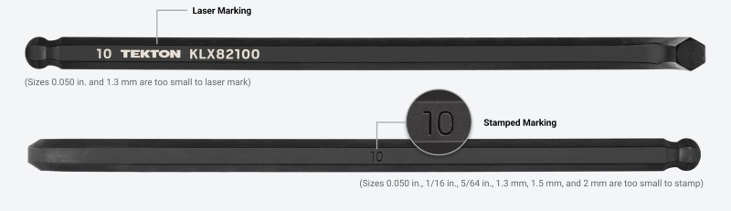 With the exception of the smallest sizes, Tekton L-key sizes are marked in two ways—both with a high-visibility laser marking and a stamped marking.
