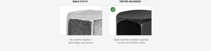 Designed for Torque and Speed ![]() Comfortable, Versatile Handle Design The handle's large, contoured shape is designed to fit your hand and make it comfortable to spin the tool and apply torque from various positions. ![]() Tight Fit with Fasteners We precisely manufacture our hex key geometry on the large end of the applicable range, resulting in less slop in fasteners. ![]() Two Measures of Tolerance Control We measure our hex key tolerances in two ways, from point-to-point and side-to-side, to ensure the highest standards of dimensional accuracy and consistency. 20º Ball Angle Increases Access Our keys implement a steep ball end angle that increases your ability to access fasteners while still maintaining sufficient strength. ![]() Refined Edges Tekton T-handle keys have slightly chamfered edges (except sizes that are too small to be chamfered: 2 mm and 5/64 in.) and a smooth top face to optimize engagement with fasteners. ![]() Materials and FinishesMolded Handle and Steel KeyOur T-handle keys are made the same way as our L-keys with the addition of a molded handle that makes applying torque easier and more comfortable. ![]() Corrosion-Resistant Finish We coat all of our keys with a durable manganese phosphate finish that’s resistant to corrosion. ![]() Clear Markings With the exception of the smallest sizes, Tekton T-handle sizes are marked in three ways—a high-visibility laser marking, a stamped marking, and a painted inset marking that can't wear off. ![]() Organization FeaturesEasy-to-Use Key StandOur custom T-handle stand is designed to guide each key into its slot, making it easy to return your tools to their places. Slots Matched to Hex Geometry We coat all of our keys with a durable manganese phosphate finish that’s resistant to corrosion. ![]() Quick Size Identification With the exception of the smallest sizes, Tekton T-handle sizes are marked in three ways—a high-visibility laser marking, a stamped marking, and a painted inset marking that can't wear off. ![]() Mounts to Bench Top Three holes on the bottom of the stand allow for mounting to a bench top. ![]() 18 Gauge Steel Stand ![]() |