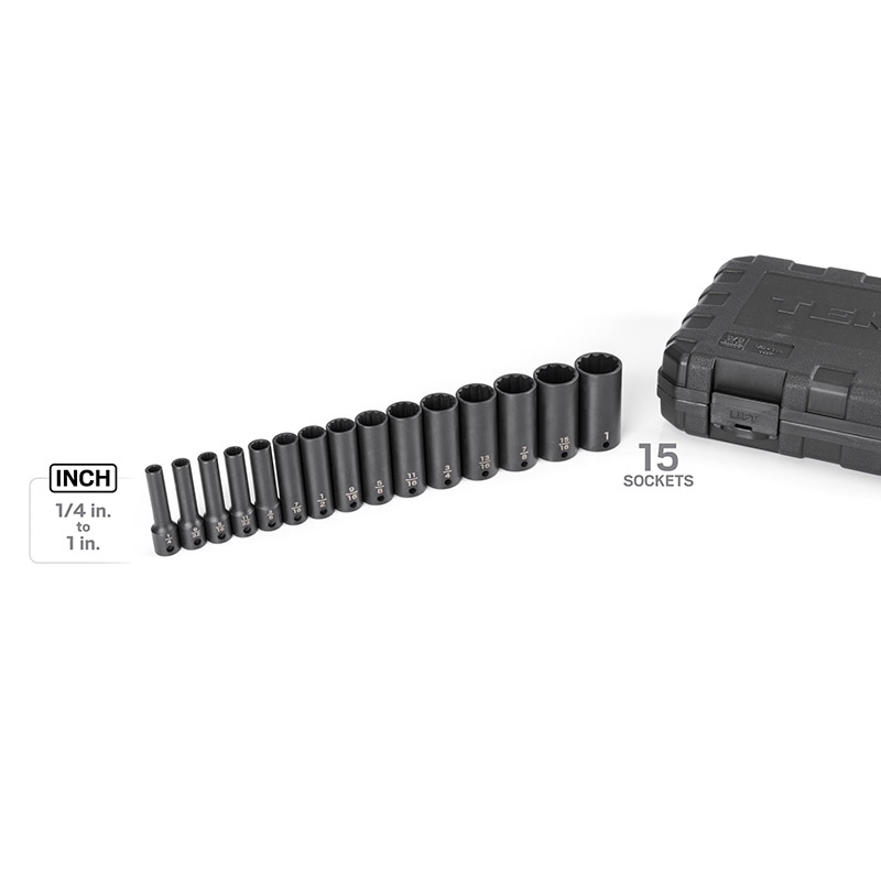 Tekton 3/8 Inch Drive Deep 12-Point Impact Socket Set with Case, 15-Piece (1/4-1 in.)