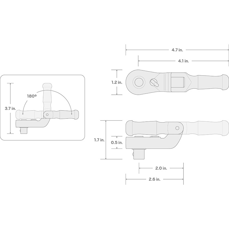 Designed for Versatility Mini Offset Ratchet When fully extended, it’s a small ratchet with an offset handle. ![]() Angled-Handle Ratchet To reduce the working swing arc, the open end is angled 15 degrees so the wrench can be flipped over with each rotation to engage a fastener twice as often. ![]() Ergonomic Palm Ratchet When fully closed, it's an ergonomic palm ratchet. ![]() Smooth Joint The non-locking joint gives the handle a continuous 180-degree range of motion. It's designed with just the right amount of friction so that the handle won't flop around. ![]() 90-Tooth Gear The single half-moon pawl maintains 9 teeth engaged with the gear at all times so that it won't slip or skip under stress. |