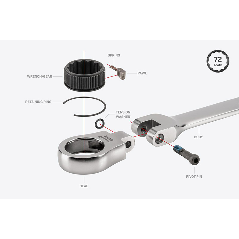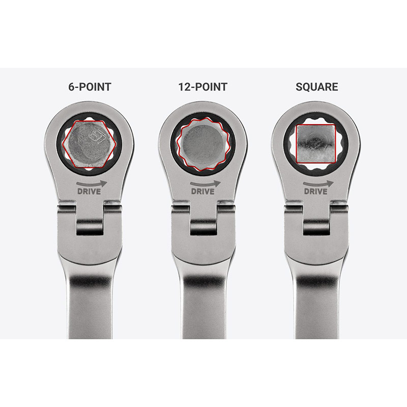 180º Flex Heads The flex head sweeps smoothly through 180 degrees without any set positions. This allows the wrench to operate at any angle and navigate around obstructions in its swing path. 12-Point Box Ends Fits multiple types of fasteners, including 6-point, 12-point, and square. Clear Markings Tekton flex head ratcheting wrenches are permanently marked in two ways: a high-visibility laser marking and a stamped marking. ![]() Smooth, Satin Chrome Finish We make our ratcheting wrench bodies from 6140 chromium-vanadium steel and heat-treat them to 42-49 HRC. The wrenches are abrasive-blasted to create a finely textured finish, which is then plated with trivalent chromium. |