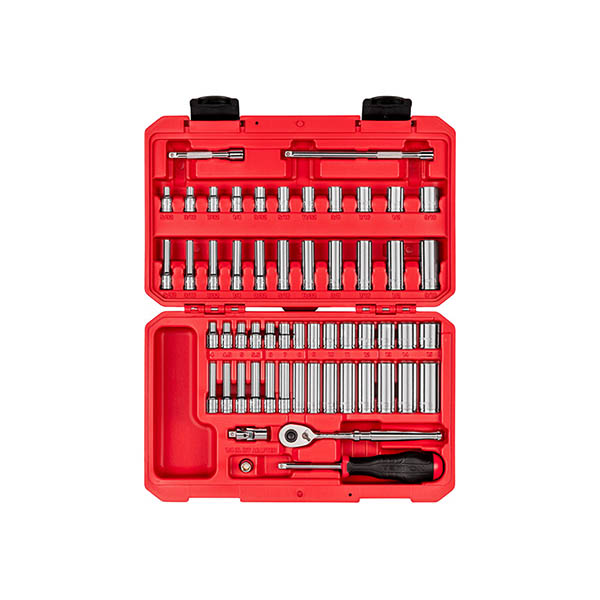 Large, Stamped Markings - Permanently impressed into the material by a roll-stamp die. - As large as possible while still being readable along the socket's curved surface - Clearly visible size numbers with extra-deep outline ![]() Fully Stepped Shoulders Narrowed diameter stretches to the base of the socket on small, deep-length sizes. This provides greater reach into tight, recessed areas. ![]() ![]() Exterior and Interior Finishes - Chrome-plated exterior is highly corrosion resistant and wipes clean to a mirror finish - Interior is protected against rust with clear coat, rather than commonly-used metallic paint ![]() 12-Point Socket Opening Get more access positions for multiple types of fasteners. ![]() ![]() Prevents Fastener Round-Off Radiused corners prevent fastener round-off by applying force to a fastener's flat sides, rather than its corners. ![]() Secure Drive Tool Engagement Detent grooves and beveled edges provide a smooth and secure connection with the drive tool. ![]() High Torque Strength Meets minimum value of 1.2 times the ANSI standard for Proof Torque. Verified by a single-cycle test that applies torque until specified value is reached without failure or permanent deformation. ![]() 90-Tooth Ratchet - 4-degree swing arc - Ultra-compact head is reduced in all dimensions - Quick-release drive locks sockets onto tang and releases with the press of a button ![]() Included Accessories3 and 6 Inch ExtensionsReach past obstructions and into tight, narrow spaces. ![]() Universal Joint Reach around obstructions and access fasteners at an angle. ![]() Spinner Handle Attach sockets to the spinner handle and use it like a nut driver. ![]() Magnetic Hex Bit Holder Adapt any 1/4 inch hex shank bit to 1/4 inch drive ratchets, driver handles, and other drive tools. ![]() Carrying Case - Resilient high-density polyethylene material withstands exposure to common lubricants, fuels, and solvents. - Strong latches and metal hinge pins - Molded size markings for each tool inside the case ![]() |