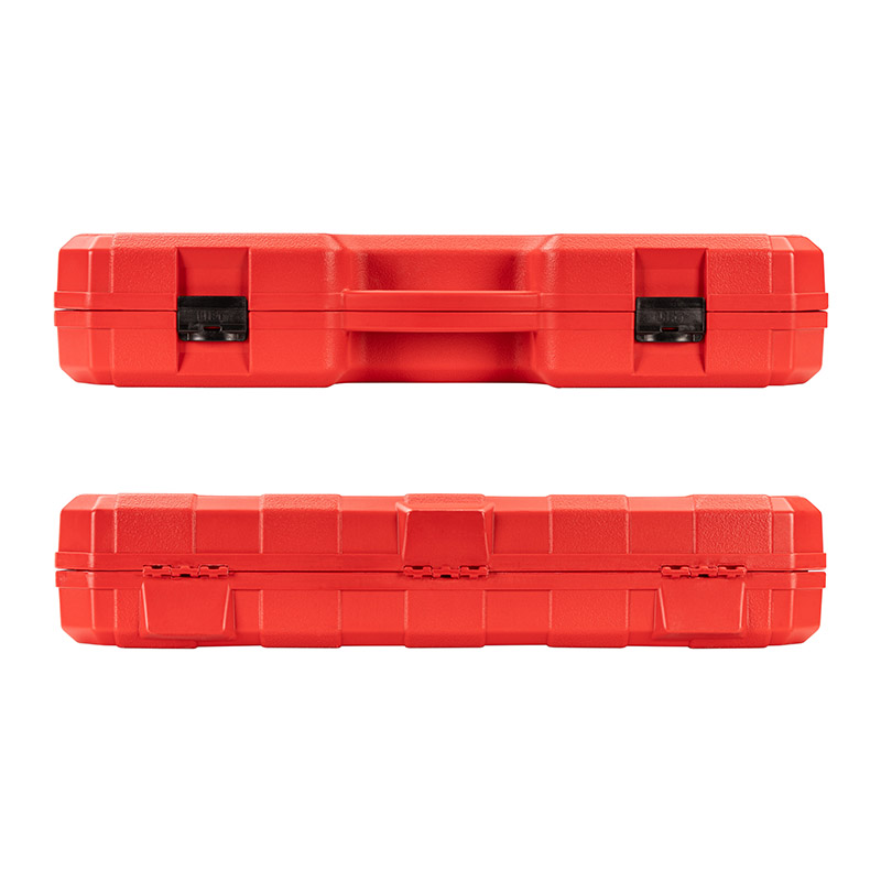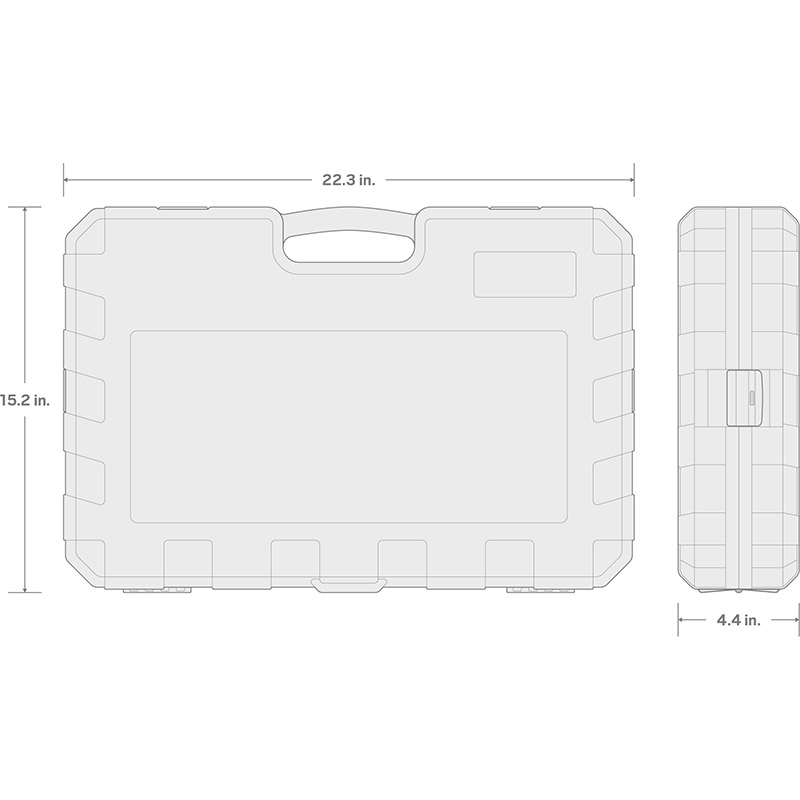 Large, Stamped Markings - Permanently impressed into the material by a roll-stamp die. - As large as possible while still being readable along the socket's curved surface - Clearly visible size numbers with extra-deep outline ![]() Fully Stepped Shoulders Narrowed diameter stretches to the base of the socket on small, deep-length sizes. This provides greater reach into tight, recessed areas. ![]() ![]() Exterior and Interior Finishes - Chrome-plated exterior is highly corrosion resistant and wipes clean to a mirror finish - Interior is protected against rust with clear coat, rather than commonly-used metallic paint ![]() 12-Point Socket Opening Get more access positions for multiple types of fasteners. ![]() ![]() Prevents Fastener Round-Off Radiused corners prevent fastener round-off by applying force to a fastener's flat sides, rather than its corners. ![]() Secure Drive Tool Engagement - Four detent grooves provide a secure connection with the retaining ball of a drive tool - Beveled inner rims help guide the socket onto other tools ![]() High Torque Strength Meets minimum value of 1.2 times the ANSI standard for Proof Torque. Verified by a single-cycle test that applies torque until specified value is reached without failure or permanent deformation. ![]() 90-Tooth Ratchet - 4-degree swing arc - Ultra-compact head is reduced in all dimensions - Quick-release drive locks sockets onto tang and releases with the press of a button ![]() Breaker Bar - 230-degree pivoting head without preset positions - 18 inch long handle for increased leverage ![]() Included Accessories3 and 6 Inch ExtensionsReach past obstructions and into tight spaces. Knurled band provides grip for starting or turning loosened fasteners. ![]() Universal Joint Pin-style joints rotate smoothly and continuously to access fasteners at up to 55-degree angles. ![]() Carrying Case - High-density polyethylene material withstands common lubricants, fuels, and solvents - Carrying handle, strong latches, and metal hinge pins - Molded size markings for each tool and a deep parts tray ![]() |