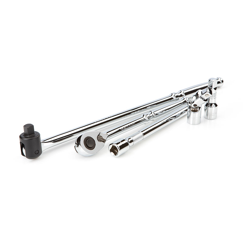 Large, Stamped Markings - Permanently impressed into the material by a roll-stamp die. - As large as possible while still being readable along the socket's curved surface - Clearly visible size numbers with extra-deep outline ![]() Fully Stepped Shoulders Narrowed diameter stretches to the base of the socket on small, deep-length sizes. This provides greater reach into tight, recessed areas. ![]() ![]() Exterior and Interior Finishes - Chrome-plated exterior is highly corrosion resistant and wipes clean to a mirror finish. - Interior is protected against rust with clear coat, rather than commonly-used metallic paint. ![]() 6-Point Socket Opening Get more access positions for multiple types of fasteners. ![]() Prevents Fastener Round-Off Radiused corners prevent fastener round-off by applying force to a fastener's flat sides, rather than its corners. ![]() Secure Drive Tool Engagement Detent grooves and beveled edges provide a smooth and secure connection with the drive tool. ![]() High Torque Strength Meets minimum value of 1.2 times the ANSI standard for Proof Torque. Verified by a single-cycle test that applies torque until specified value is reached without failure or permanent deformation. ![]() 90-Tooth Ratchet - 4-degree swing arc - Ultra-compact head is reduced in all dimensions - Quick-release drive locks sockets onto tang and releases with the press of a button ![]() Breaker Bar - 230-degree pivoting head without preset positions - 18 inch long handle for increased leverage ![]() Included Accessories3 and 6 Inch ExtensionsReach past obstructions and into tight spaces. Knurled band provides grip for starting or turning loosened fasteners. ![]() Universal Joint Pin-style joints rotate smoothly and continuously to access fasteners at up to 55-degree angles. ![]() Carrying Case - High-density polyethylene material withstands common lubricants, fuels, and solvents - Carrying handle, strong latches, and metal hinge pins - Molded size markings for each tool and a deep parts tray ![]() |