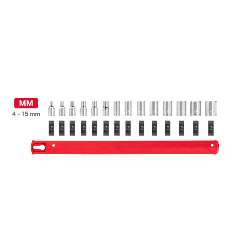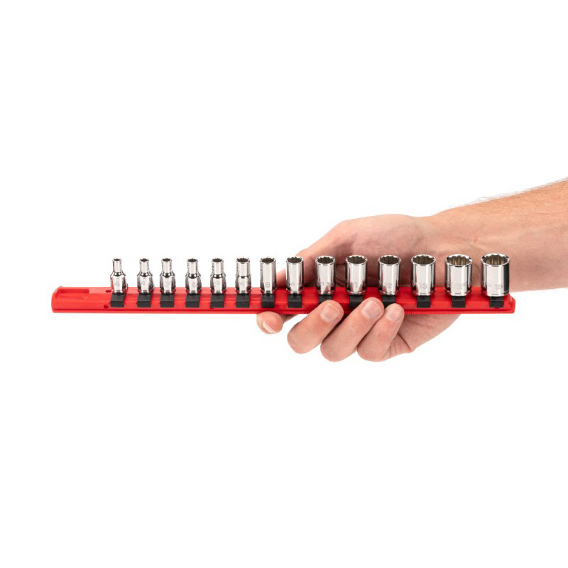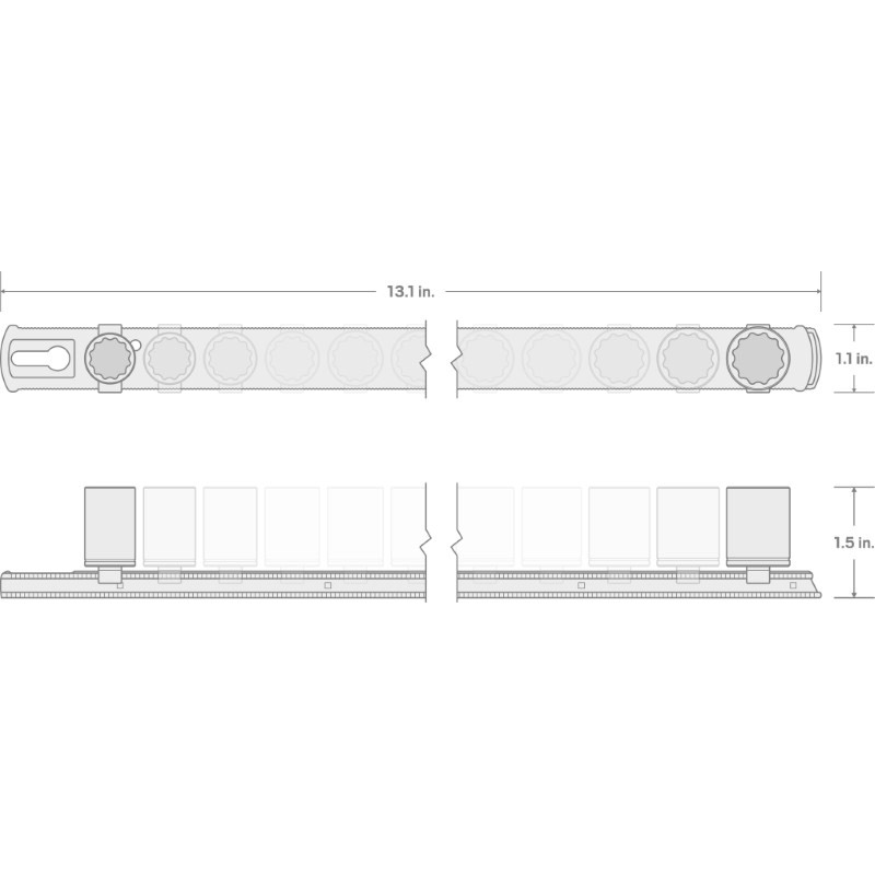 Large, Stamped Markings - Permanently impressed into the material by a roll-stamp die. - As large as possible while still being readable along the socket's curved surface - Clearly visible size numbers with extra-deep outline ![]() Exterior and Interior Finishes - Chrome-plated exterior is highly corrosion resistant and wipes clean to a mirror finish - Interior is protected against rust with clear coat, rather than commonly-used metallic paint ![]() 12-Point Socket Opening Get more access positions for multiple types of fasteners. ![]() ![]() Prevents Fastener Round-Off Radiused corners prevent fastener round-off by applying force to a fastener's flat sides, rather than its corners. ![]() Secure Drive Tool Engagement Detent grooves and beveled edges provide a smooth and secure connection with the drive tool. ![]() 1/4 Inch Drive Standard Length Socket Proof Torque Meets a minimum value of 1.3 times the ASME standard for proof torque. Verified by a single-cycle test that applies torque until the specified value is reached without failure or permanent deformation. ![]() Socket Rail Organization - Patented twist-to-lock design securely holds sockets on the rail - Keyhole slot mounts to wall or workbench - Combine multiple socket rails with trays and other accessories ![]() |