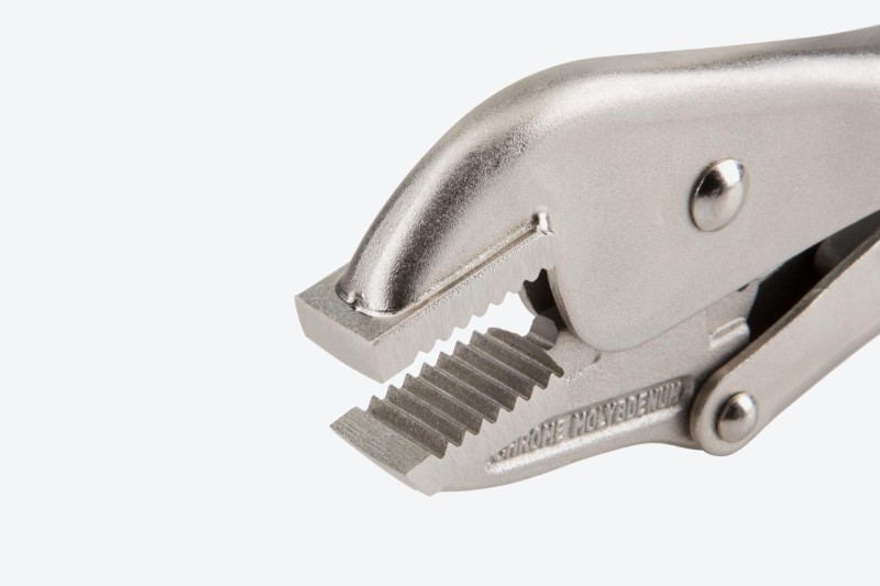 Wide and relatively short jaws clamp and hold flat stock, L-angle, and sheet metal in position for welding or assembly. Deep, sharp, regularly-spaced teeth offer an evenly distributed grip on smooth, flat surfaces. ![]() Pull-to-Release Lever Easily set, release, and reposition the clamp with one hand and with more control than a traditional pinch-style lever. Large Adjustment Knob The adjustment knob is knurled and round to provide grip for making adjustments even when you’re wearing gloves or have slippery hands. ![]() Tensioning Through-Hole Get extra leverage and fine-tune your clamping force by inserting a screwdriver or hex key into the through-hole to create a T-handle. ![]() High-Strength Rivets Three main rivets work together to make up the 4-point mechanical structure of the pliers and give it its strength. To make sure ours can withstand high shear forces, the rivets are made from tough 4135 chromium molybdenum steel. ![]() Strong Jaws and Teeth The jaws are made from 4140 chromium molybdenum steel, an alloy that offers toughness, machinability, and corrosion resistance. The teeth are hardened to 45-50 HRC and should not chip or strip even on fasteners up to Grade 8 or Class 12.9. ![]() Durable Nickel-Plated Finish Before assembly, the individual jaw, handle, lever, and crossbar parts are shot-peened to create smooth, consistent surfaces. The final finish is a durable nickel plating that protects against corrosion. ![]() |