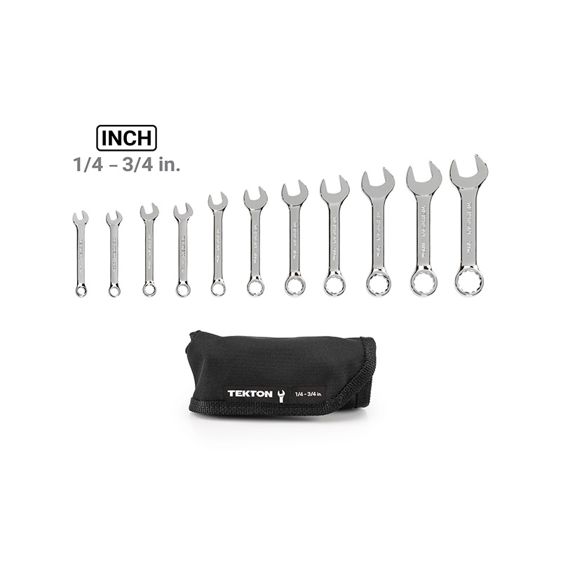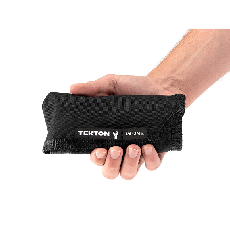 Shorter Length Improves Access The stubby combination wrenches have a shorter handle than full-size combination wrenches for increased versatility and access into tight spaces. Angled Open End To reduce the working swing arc, the open end is angled 15 degrees so the wrench can be flipped over with each rotation to engage a fastener twice as often. ![]() ![]() Offset Box End The box end is offset 15 degrees, creating clearance for your fingers and making it easier to reach around obstructions. ![]() 12-Point Box End A 12-point box end doubles the available access angles, as compared to a 6-point end. In order to prevent rounding off fasteners, the box end is designed to contact and apply force to the sides of a fastener head and not the corners. ![]() Clear, Stamped Markings A size marking is permanently stamped onto both sides of each wrench for quick identification. ![]() Storage FeaturesIdeal for On-the-Go The handle makes it easy to carry wrenches on the go. ![]() Durable Material The polyurethane-backed 600 x 600 denier polyester is both abrasion and tear resistant, and has a Durable Water Repellent (DWR) coating. ![]() Easy-Access Design The pouch design minimizes bulk from extra material so the wrenches can be quickly accessed without any fabric flaps getting in the way. |